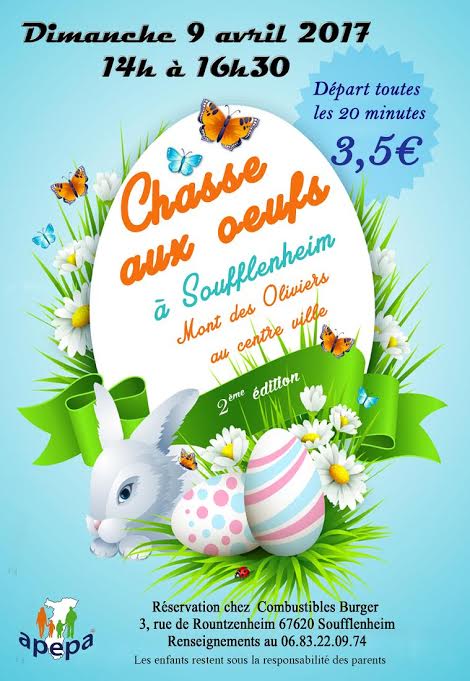 L’Apepa, association de parents d’élèves organise une chasse aux œufs le dimanche 9 avril 2017 au Mont des Oliviers à Soufflenheim.